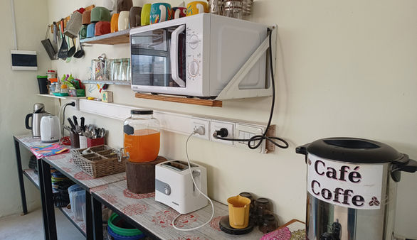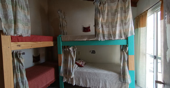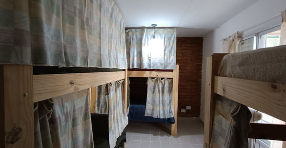 Habitacion compartida mixta de seis camas (tres literas).Planta Baja, vista a la calle. Baño modular compartido en pasillo.